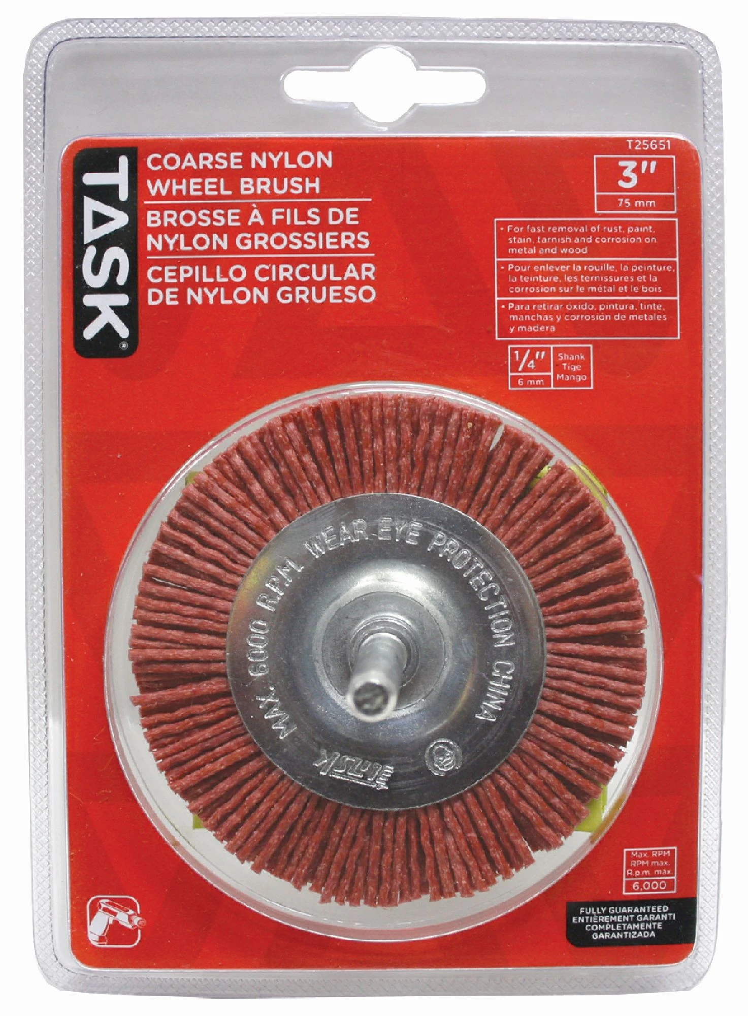 6000 Max RPM; For removal of rust, paint, stain, tarnish and corrosion on metal and wood;3″ Diameter Coarse Nylon Wheel Brush