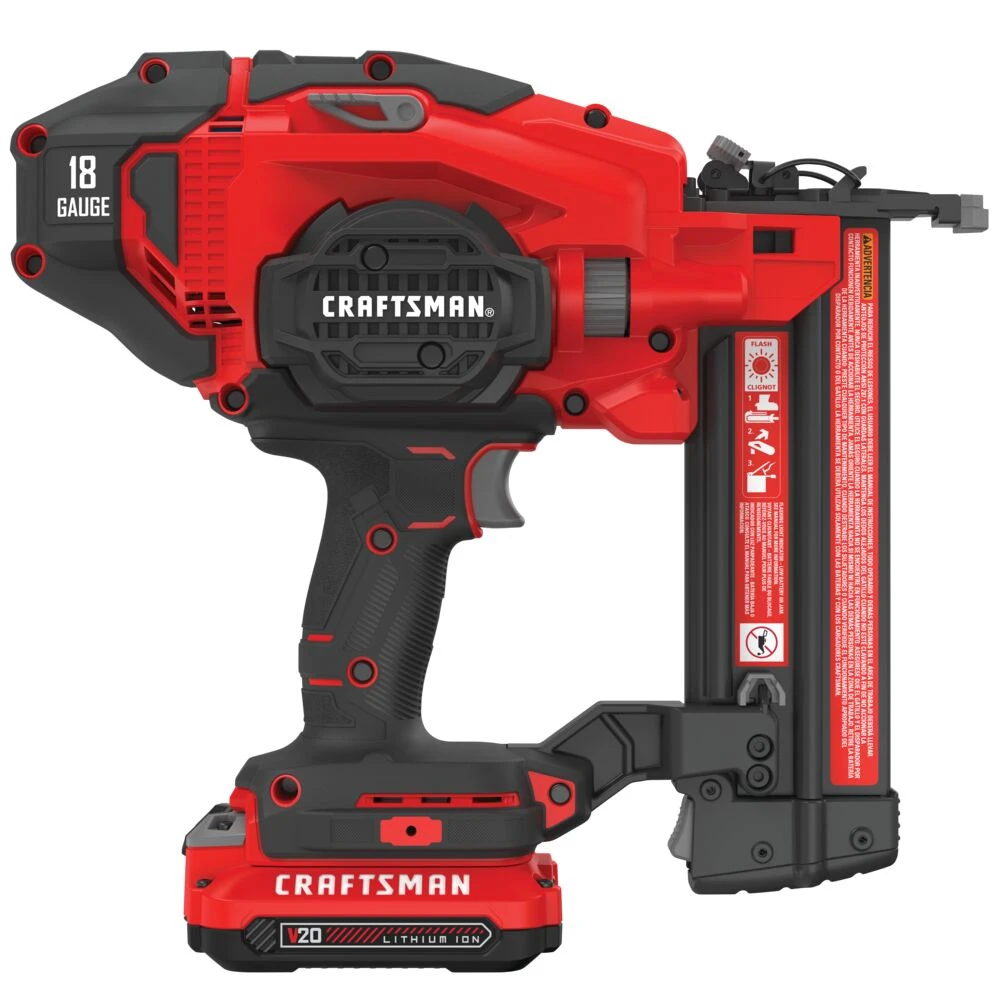 20V MAX* 18G NAILER KIT,CRAFTSMAN 20 V MAX cordless nailer drives adhesive collated 18-gauge brad nails,Fully cordless design eliminates the need for compressors, hoses or costly gas cartridges,Flywheel motor design provides consistent firing power in various climate conditions and materials,Tool-free depth settings for quick and intuitive set up,Tool-free jam and stall settings for ease of use and improved efficiency,Lightweight with optimal center of gravity provide optimal balance and comfort in hand during use,.