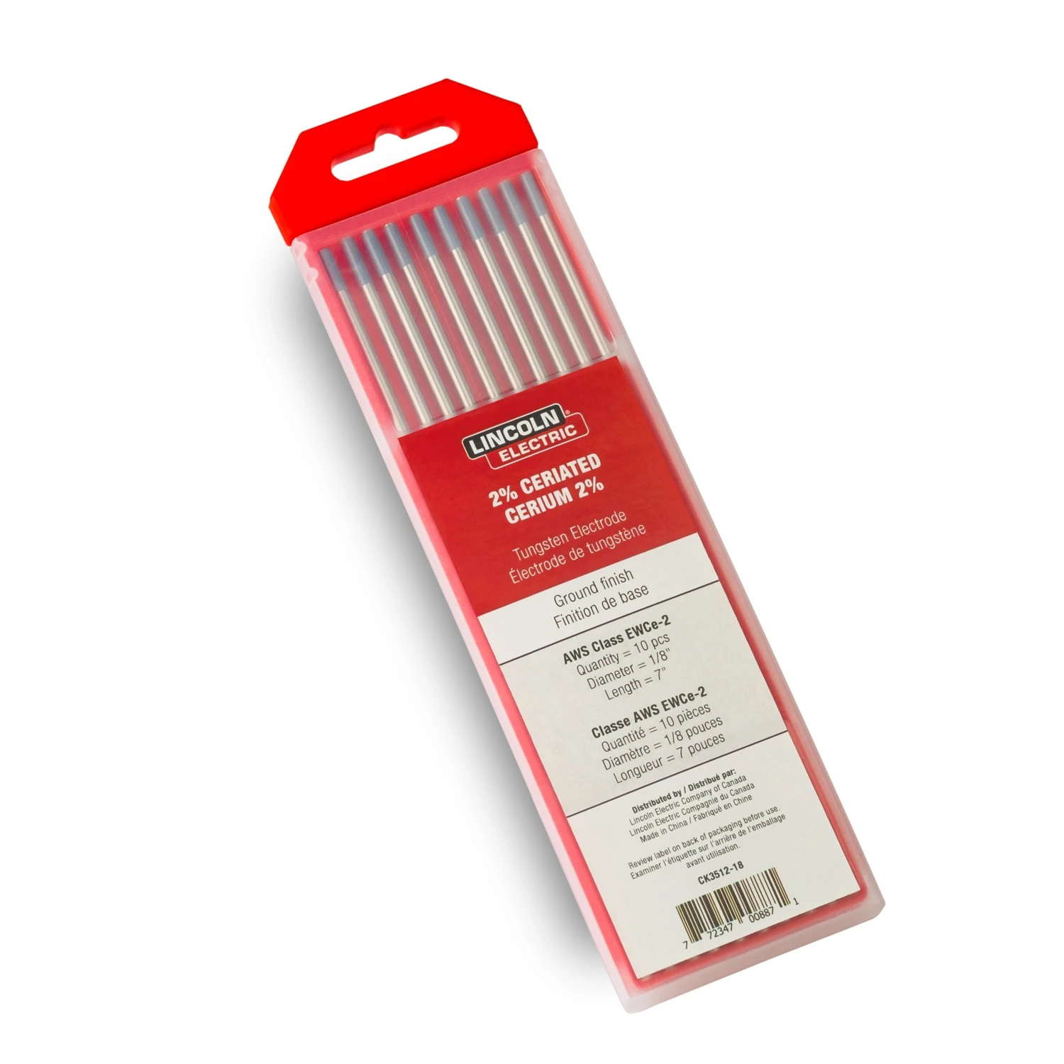 Ceriated Tungsten 1/8” (3.2 mm) 7” (178 mm) 10 Electrodes. Has excellent arc starts at low amperages, improved arc stability, and reduced rate of burn-off. Works best at low amperage range.