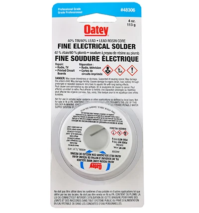 Oatey® Rosin Core Wire Solder is a tin-lead alloy wire solder with a rosin flux core for use in electrical applications, including wiring and other fine electronic work.