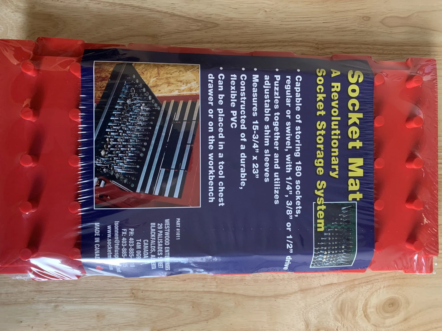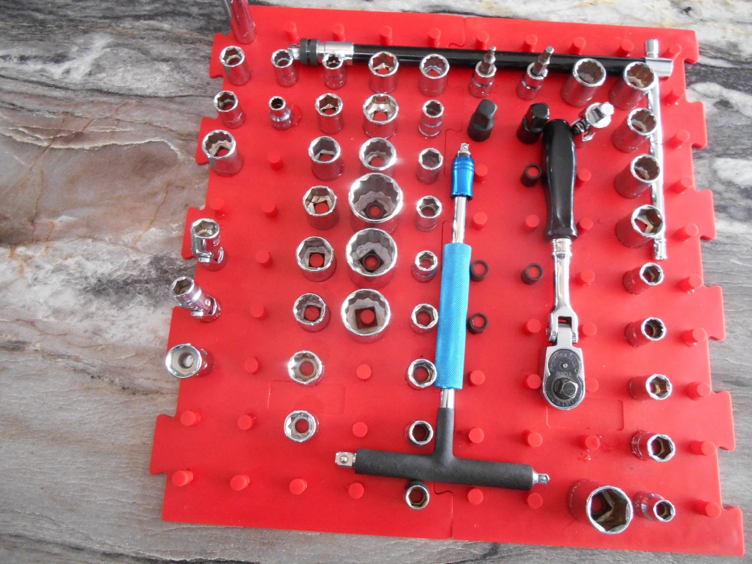 Storage system capable of storing 150 sockets, regular or swivel, with 3/8″ or 1/2″ driven end. Measures 15-3/4″ x 23″ and can be placed in a tool chest or on the workbench.