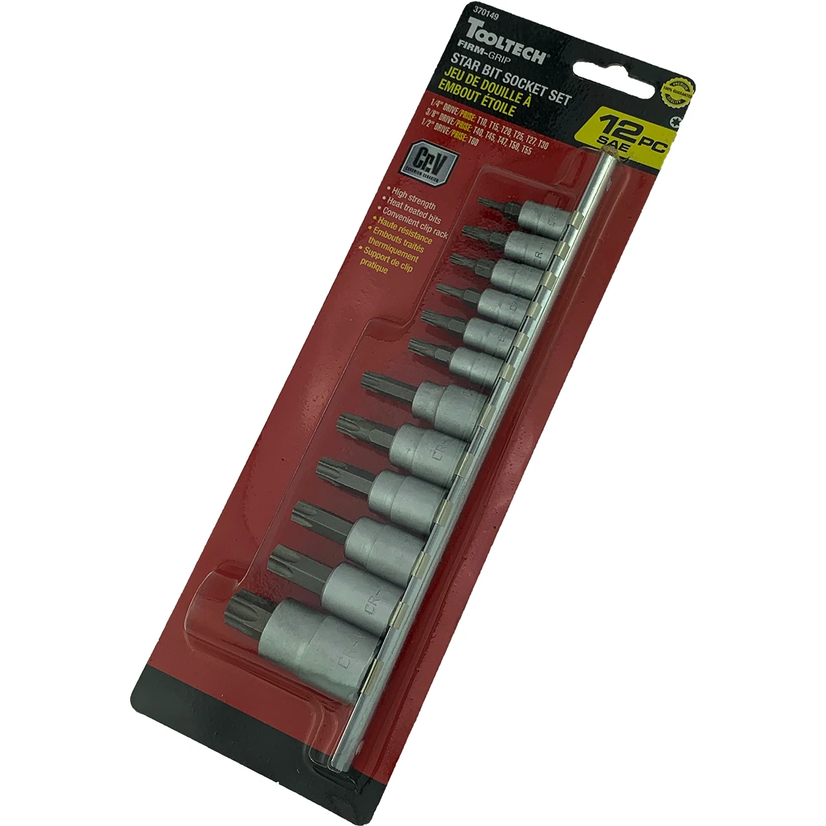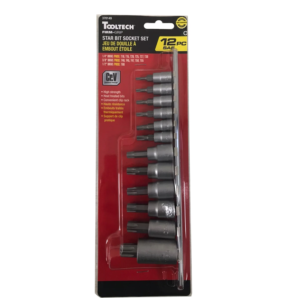 6Pcs – 1/4in Dr. T10; T15;T20;T25;T27;T30 5Pcs -3/8in T40;T45;T47;T50M T55 1Pc -1/2in Dr. T60