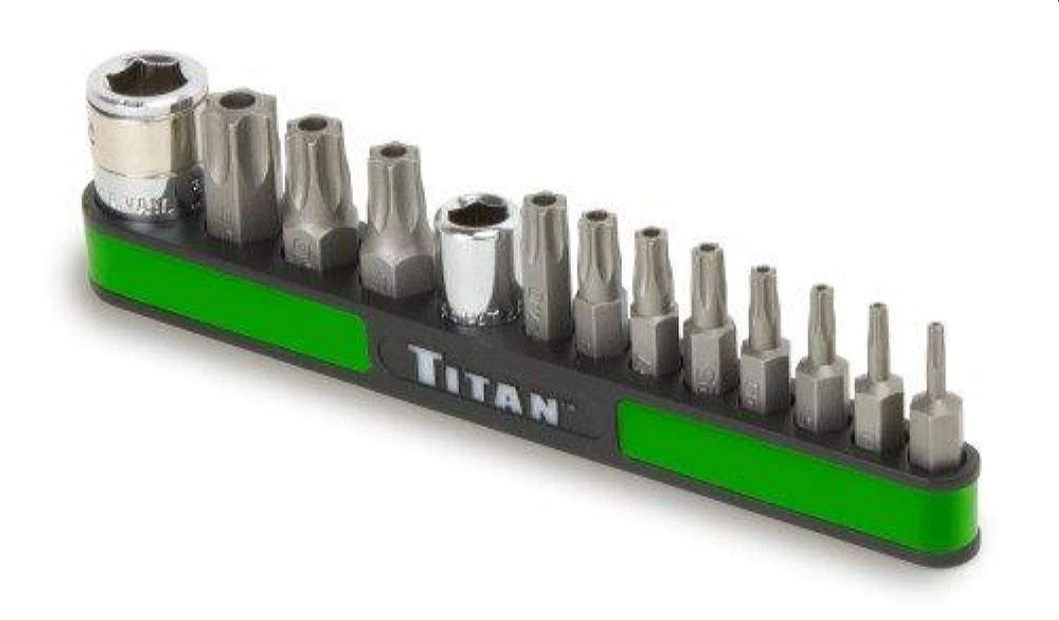 Tamper proof torx. (4-8-9372). Chrome moly bits for strength and durability. 1/4″ and 3/8″ drive bit holders. 11 bits, T8, 10, 15, 20, 25, 27, 30, 40, 45, 50 and T55.