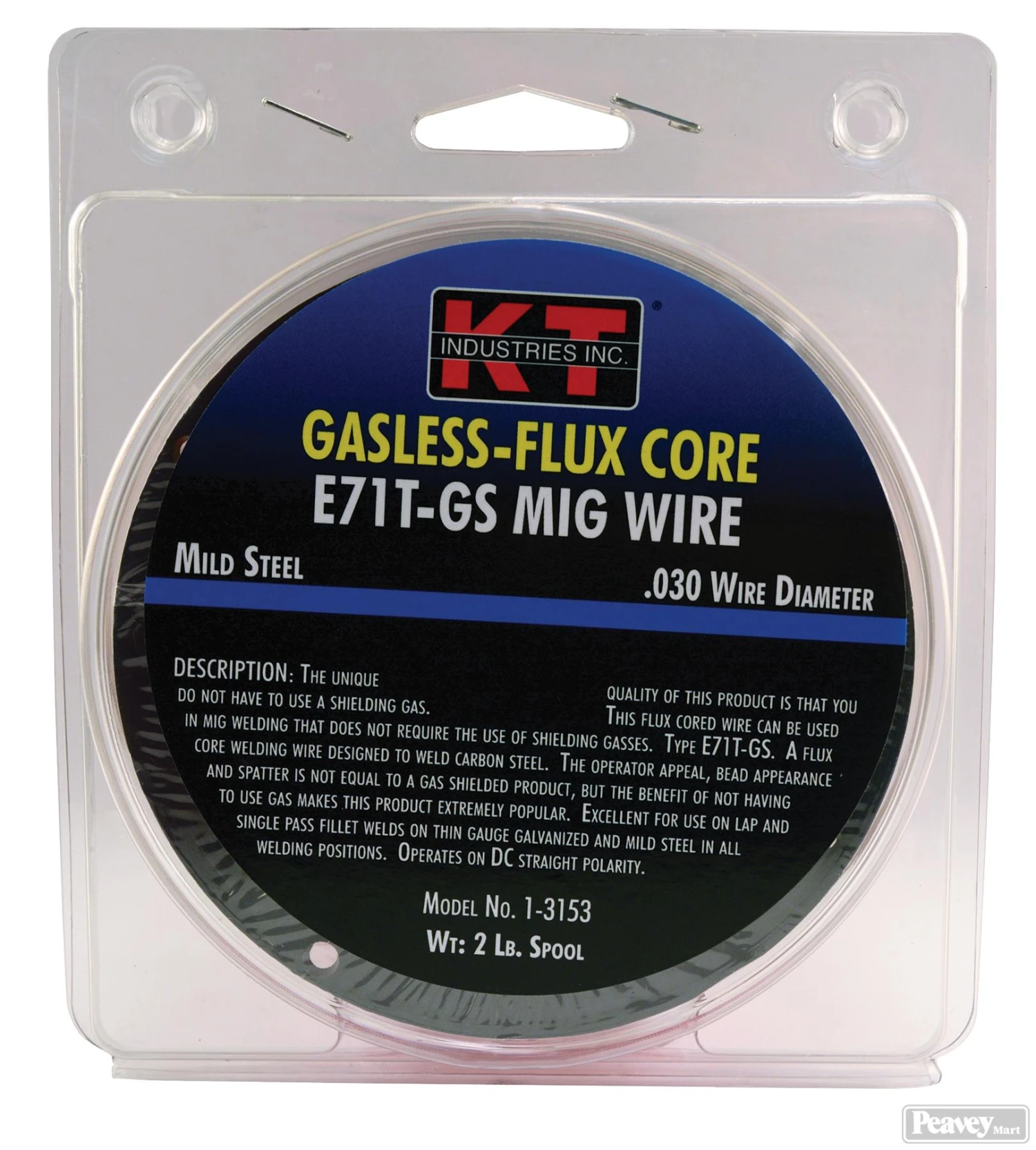 .030 – No need for shielding gas. This flux cored wire can be used in mig welding that does not require the use of shielding gasses. Type E71-T-GS. A flux core welding wire designed to weld carbon steel. The operator appeal, bead appearance and spatter is not equal to a gas shielded product, but the benefit of not having to use gas makes this product extremely popular. Excellent for use on lap and fillet welds on thin guage galvanized and mild steel in all welding positions. Operates on DC straight polarity.
